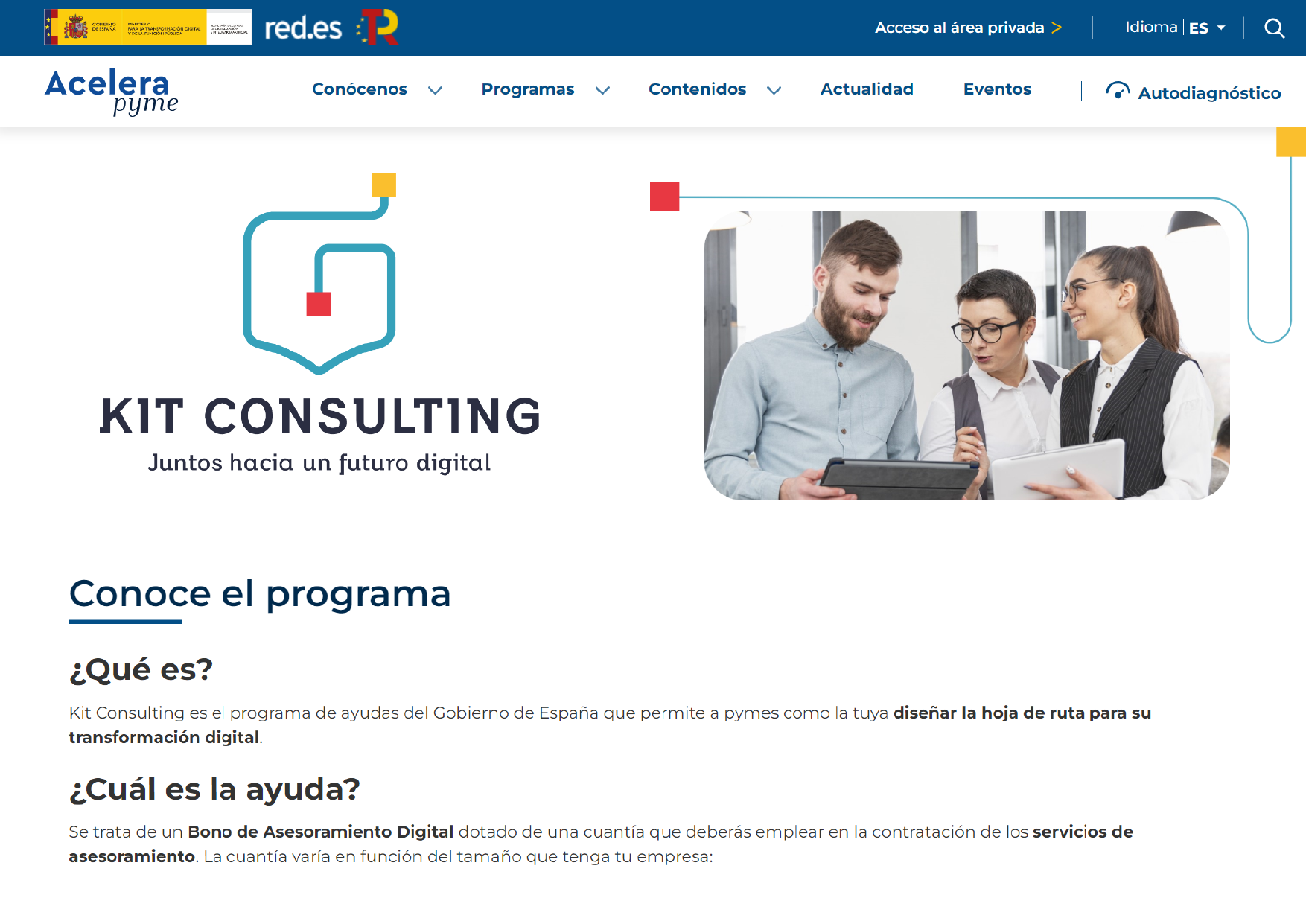En este contexto, Red.es, organismo público competente para la concesión de las ayudas del Programa Kit Consulting», pone en marcha la Convocatoria de ayudas a la contratación de servicios de Asesoramiento para la Transformación Digital de las pequeñas y medianas empresas del Segmento A (entre 10 y menos de 50 empleados), del Segmento B (entre 50 y menos de 100 empleados) y del Segmento C (entre 100 y menos de 250 empleados) en el marco de la Agenda España Digital 2026, el Plan de Digitalización de PYMES 2021-2025 y el Plan de Recuperación, Transformación y Resiliencia -Financiado por la Unión Europea- NEXT GENERATION EU (Programa Agentes del Cambio – Kit Consulting), que tiene por objeto el apoyo a la transformación digital de las pequeñas y medianas empresas mediante la concesión de ayudas para la contratación de servicios de asesoramiento.
